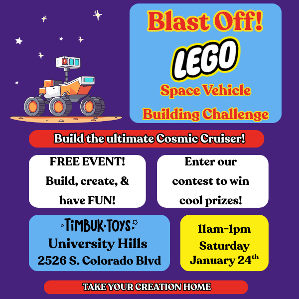Join us for a fun-filled LEGO build event where kids can design and build their very own Cosmic Cruiser! Once their creation is complete, they can enter it for a chance to win some fun prizes.