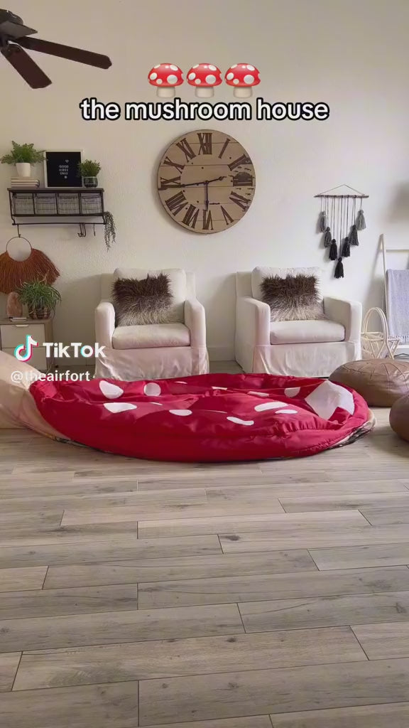 Enter a whimsical wonderland with a Mushroom House AirFort! It's easy to set up, packs away quickly into its storage bag, and is durable enough to last for years of play. Simply attach the fort to a floor fan and watch it magically inflate in less than 30 seconds. At 77" wide and 50" tall, this fantasy forest house is big enough to fit both kids and adults for playdates, movie nights, storytime, or even slumber parties!
