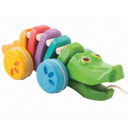When you say "see you later alligator" to this pull toy, it click-clacks away! Toddlers will giggle with glee as they interact with this bouncing, dancing alligator. It's durable, colorful, and very friendly! We love that it's sustainably made in Thailand using chemical-free rubberwood, formaldehyde-free glue, organic pigments and water-based dyes.
