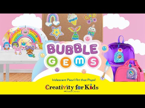 Make back to school more sparkly with DIY bubble gem backpack keychains! Crafters enjoy the focused work and satisfaction of completing this glue-free activity. Simply use the stylus tool to place iridescent bubble gems on the unicorn and mermaid characters and stickers. Once complete, kids can place their character on the stand for pretend play, or slide it inside the shiny backpack pouch so it peeks out through the bubble. Add the pom pom and clip it to a school bag! Fill it with lipgloss, loose change, or other collectible treasures! Comes with 2 backpack keychains, 2 characters with stands, assorted gems, heart and rainbow stickers, 2 pompoms, putty, stylus and instructions.