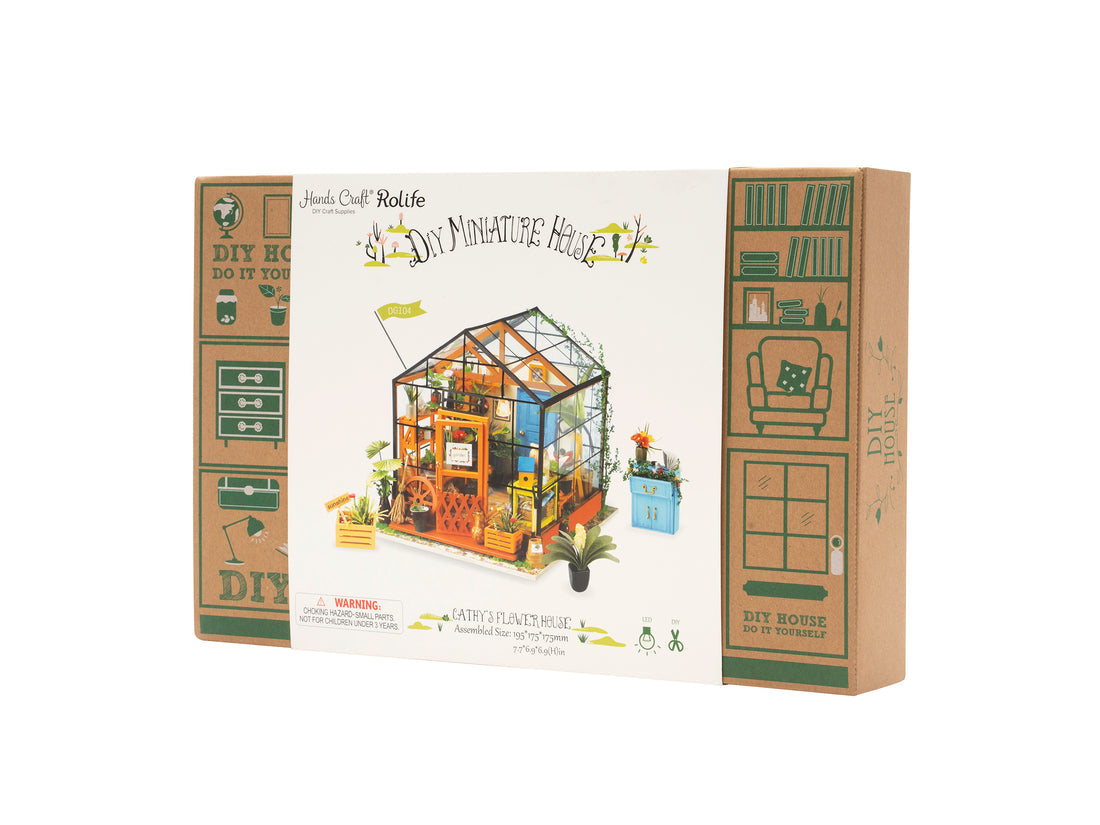 This Tiny Dollhouse kit will help you create Cathy’s Flower House. This model dollhouse room comes equipped with a shelf, potted plants, flowers, 2 doors, vines, pots, gardening tools, and more to give you a detail-oriented and well-furnished feel to your tiny space. You can even add flooring. With such amazing decor and details, this modern DIY house is sure to impress. To make the rooms look as realistic as possible, included are light fixtures with tiny LED bulbs to illuminate each little room. Comes with an instruction book with illustrations.