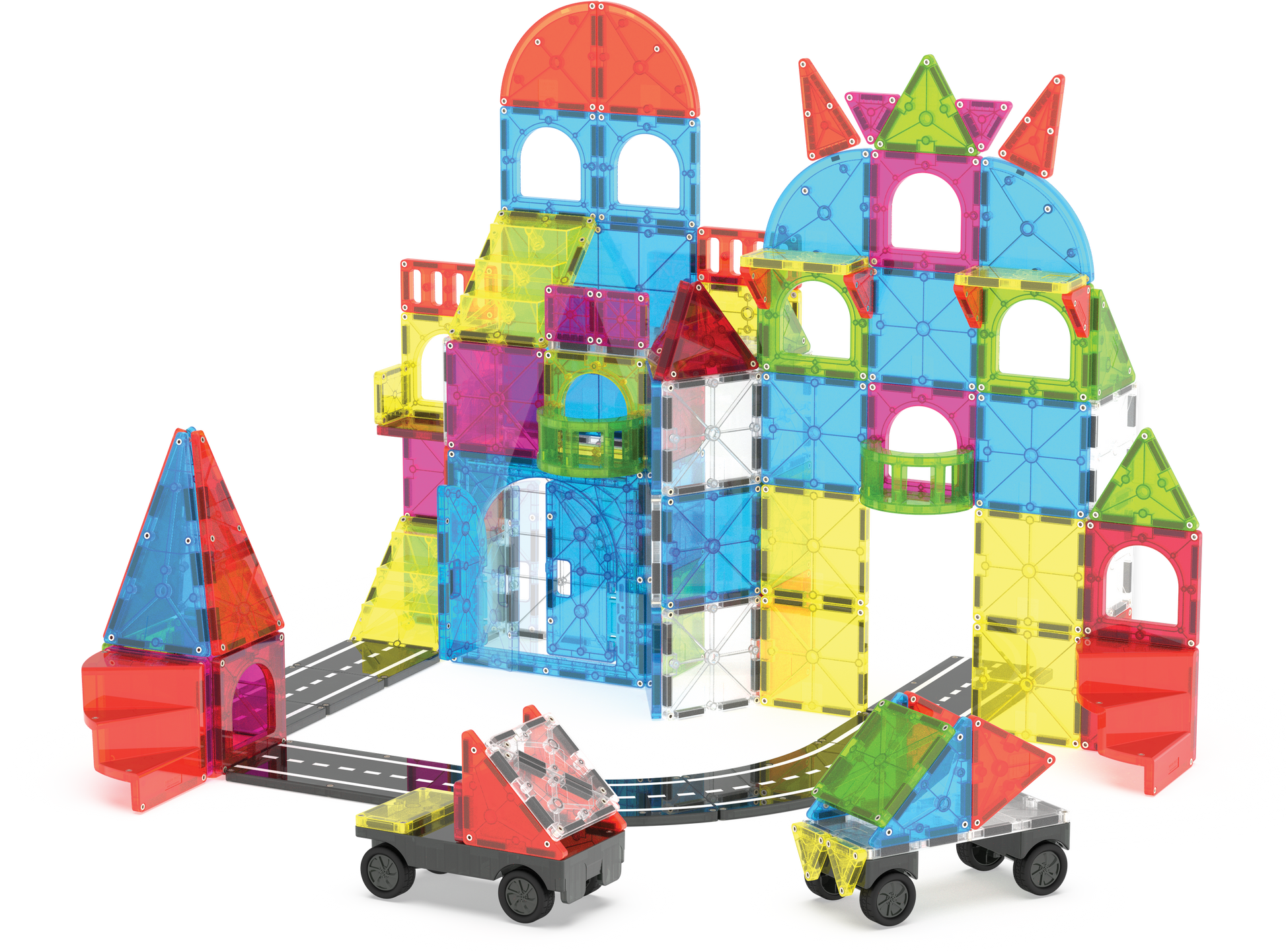 Click, connect, stack, and match... build STEM skills at home with an en-tile-ly unique open-ended building experience! There's no wrong way to play with this set of 110 colorful magnetic tiles that includes a fun combo of classic shapes and microMAGS. Kiddos build the cities of their dreams using unique shapes like spiral staircases, balconies, doors, fences, and roads, and click together vehicles using the wheel axle and car chassis. Compatible with all Magna-Tiles sets for world building.