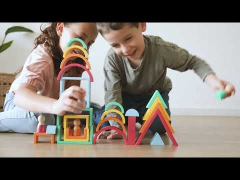 Invite your early learner into a colorful world of imaginative play and learning! These unique, gorgeous rainbow wooden blocks are designed for toddlers to stack, balance, and explore. Use them as bridges, tunnels, cradles, doorways, towers... the possibilities are endless! You'll be amazed at the storytelling potential of these 30 heirloom quality pieces: 10 arches, 10 rectangles, 5 triangles and 5 wooden people. We love the Montessori and Waldorf-inspired open-ended play, and that the wooden storage tray turns cleanup into a nesting game!